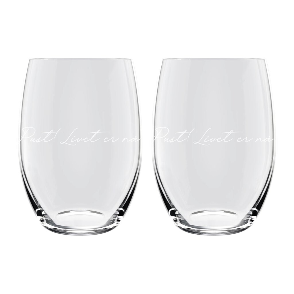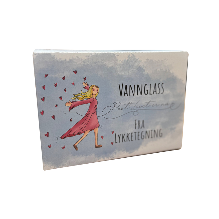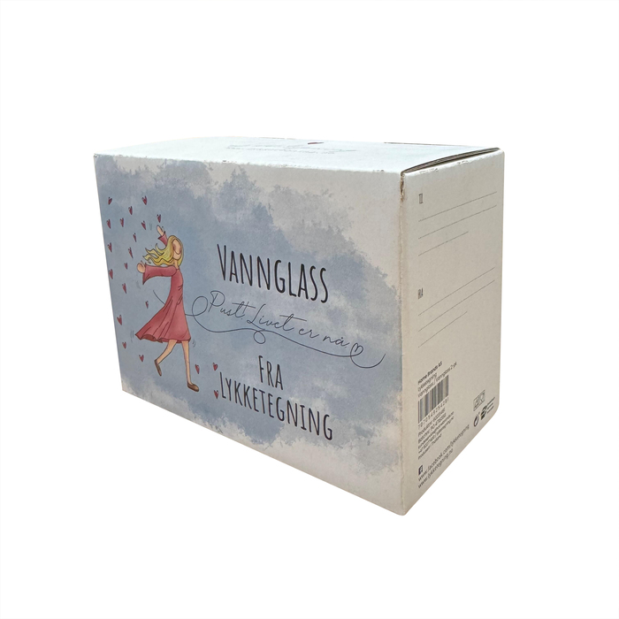 Etter den enorme suksessen med Lykketegning vinglass – over 80.000 solgte! – kommer nå endelig vannglass med inngraverte tekster.