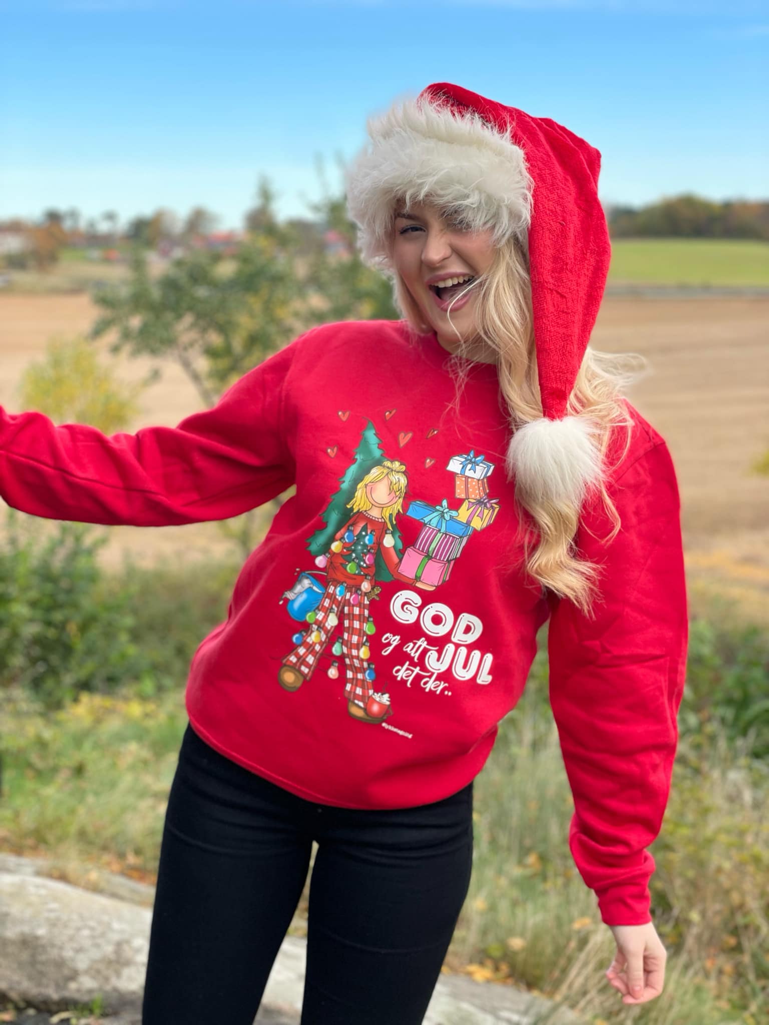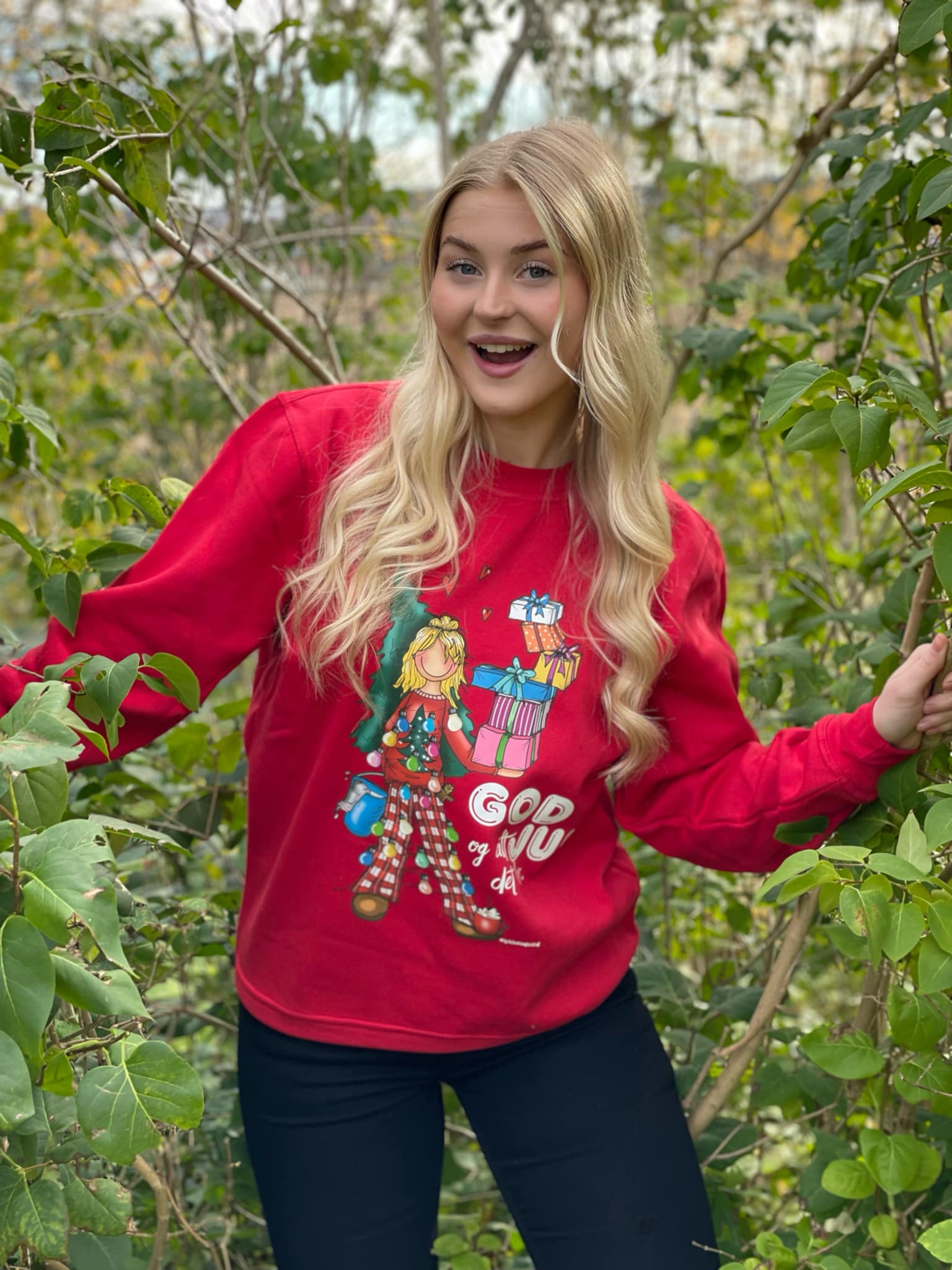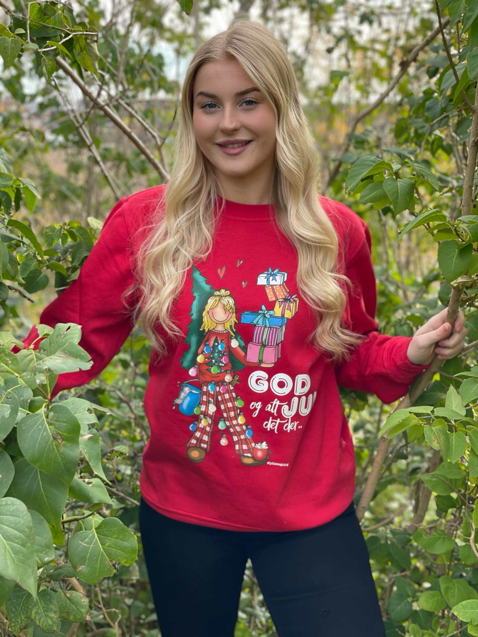 Christmas jumper from Lykketegning "Pakker og sånt" (red)