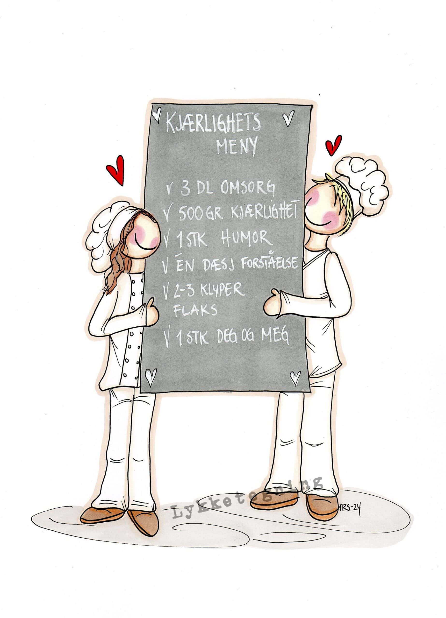 Illustrasjon til brudeparet fra Lykketegning “Kjærlighetsmenyen” Original illustrasjon. Håndtegnet