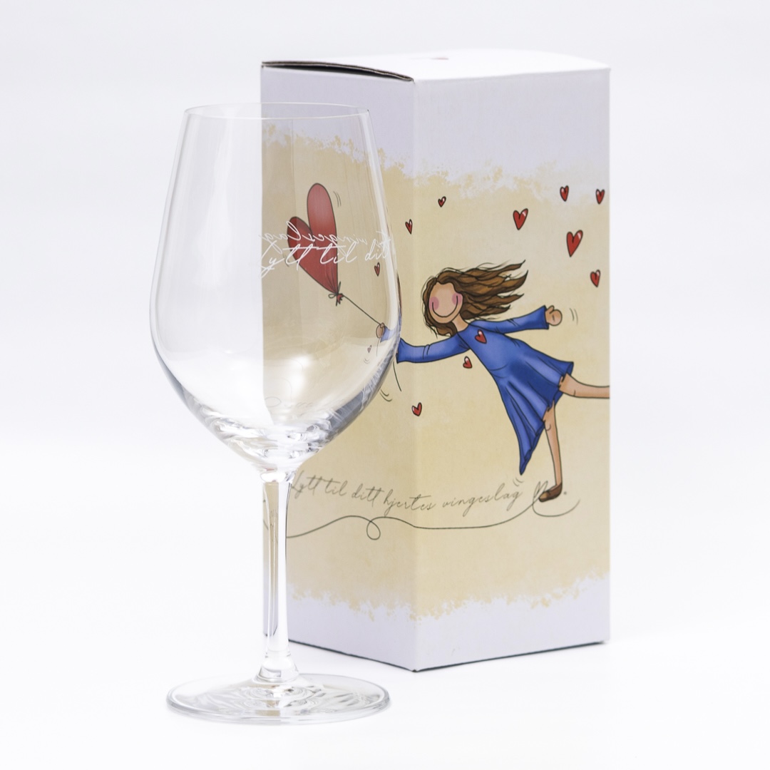 Vinglass med lekker utforming og gravering. “Lytt til ditt hjertes vingeslag”.