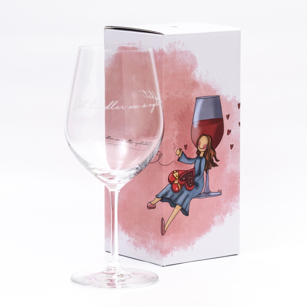 Vinglass med lekker utforming og gravering. “Det handler om å nyte øyeblikket”.