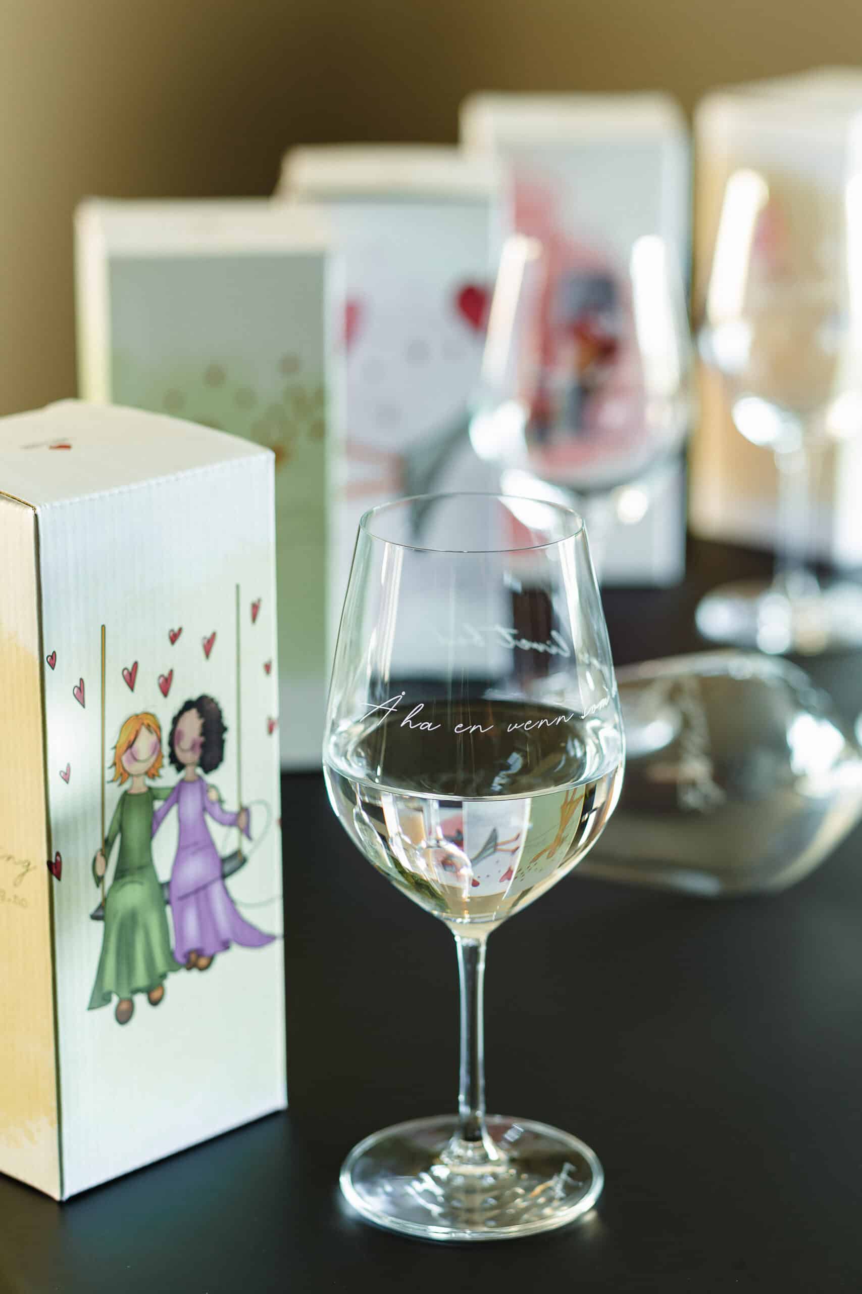 Vinglass med gravering “Å ha en venn som deg gjør livet bedre”