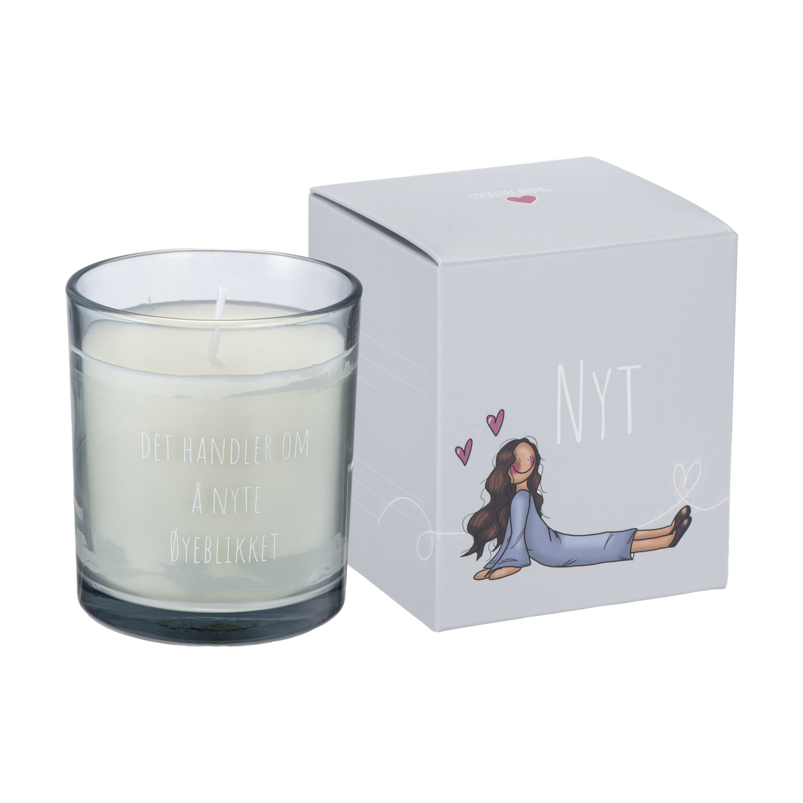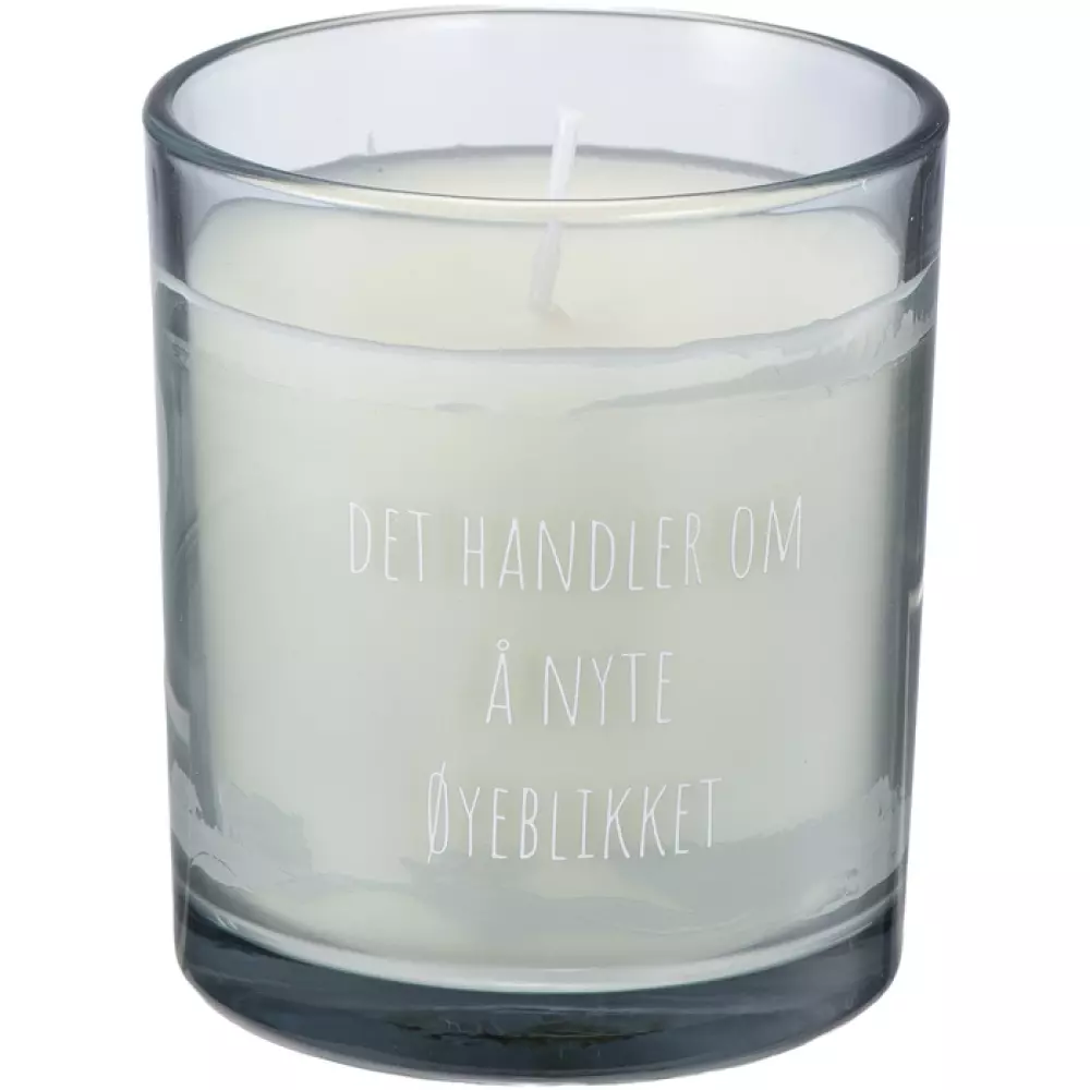 Det lyse blå glasset skaper en rolig og elegant stemning, mens den myke og rene duften fyller rommet med varme og harmoni. Med teksten «Det handler om å nyte øyeblikket» blir dette duftlyset en liten påminnelse i hverdagen om å senke skuldrene og ta vare på de stille stundene.